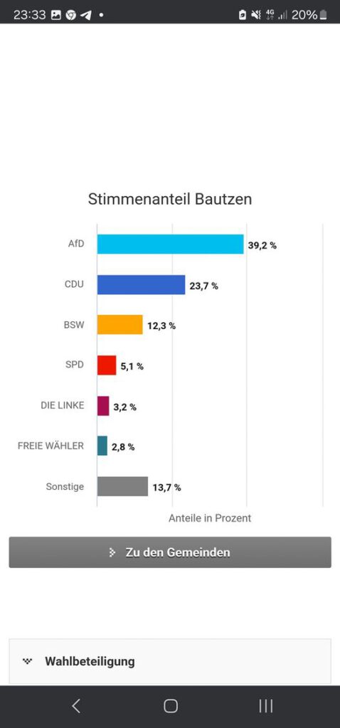 Die AfD erreichte im Wahlkreis 5 des Landkreises Bautzen sensationelle 40,6 %. Von den 40.423 abgegebenen gültigen Stimmen entfielen 16.392 auf die AfD-Kandidaten. Ich möchte mich ausdrücklich im Namen aller Kandidaten für das entgegengebrachte Vertrauen bedanken. Besonders dankbar bin ich natürlich für die 10.789, die ich erlangen konnte und die das beste Einzelergebnis im Landkreis […]