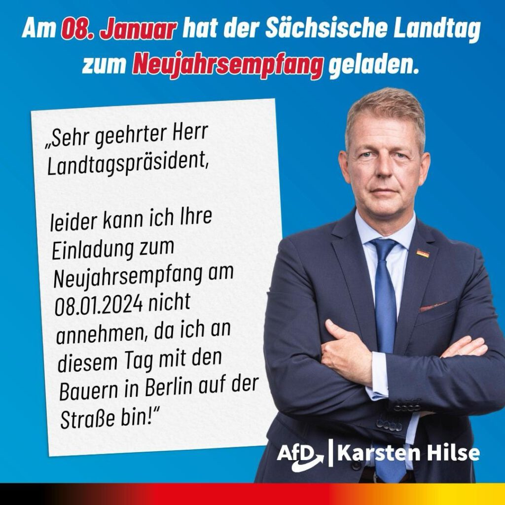 Am 08.01.2024 findet im Sächsischen Landtag der jährliche Neujahrsempfang statt. Das erste Mal seit 6 Jahren werde ich an diesem Empfang nicht teilnehmen. Ich werde in Berlin sein und gemeinsam mit den Bauern und vielen anderen Menschen aus verschiedensten Teilen des Volkes gegen die desaströseste deutsche Regierung seit dem 2. Weltkrieg demonstrieren. Schließen auch Sie […]