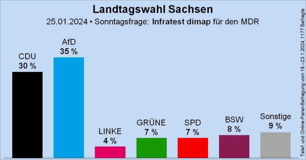 Die Lügengeschichte der Correktiv-Stasi und die vom Establishment organisierten Demonstrationen, auf denen unter anderem gefordert wurde, AfDler anzugreifen oder sie zu töten, laufen zumindest in den östlichen Bundesländern ins Leere. Die Menschen hier wissen, wie die Stasi funktionierte und funktioniert. Die AfD bleibt mit Abstand stärkste Kraft in Sachsen.